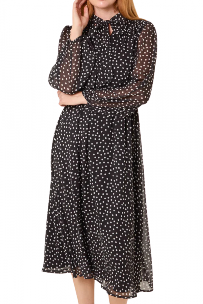 A mid-length black dress with white polka dots. The dress features a feminine bow tie and slightly sheer long sleeves that add lightness and elegance to the look.