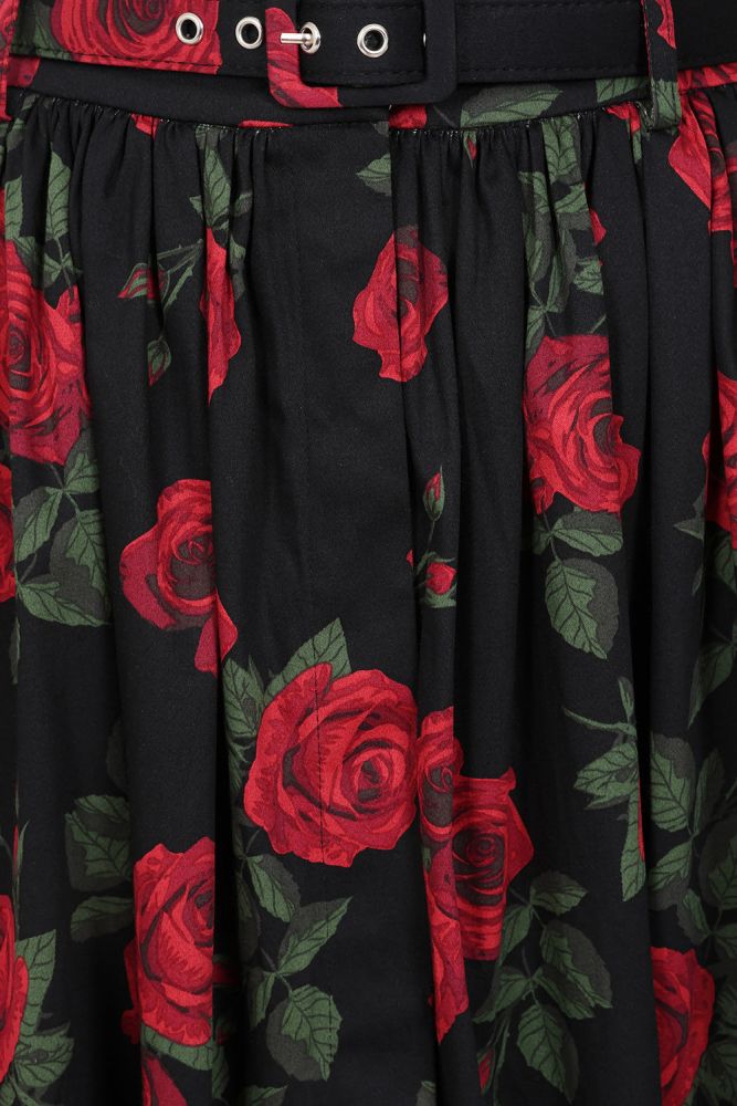 Tämä näyttävä, 50-luvun henkeä huokuva kellohame on täydellinen valinta, kun haluat tuoda asuusi ripauksen klassista eleganssia ja romanttista naisellisuutta. Mustalla pohjalla hehkuvat punaiset ruusut luovat upean kontrastin, joka kiinnittää katseet.