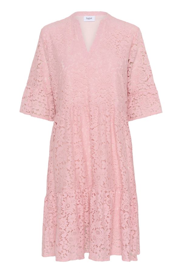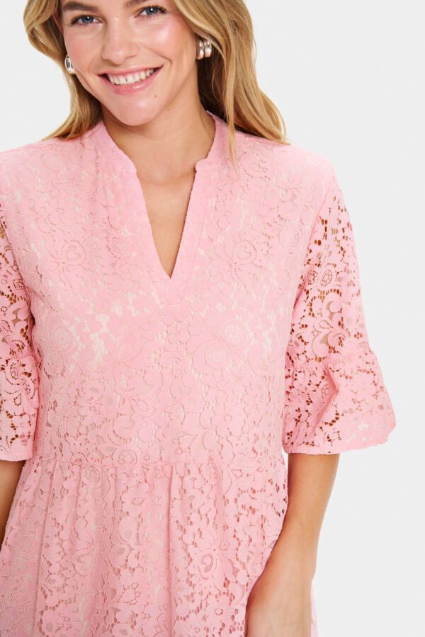 This beautiful lace dress by Saint Tropez captivates with its soft baby pink colour and romantic look. The dress is made from an eye-catching, all-over lace fabric that adds lightness and feminine elegance to the design. The lace fabric is lined underneath, except for the sleeves. The V-neckline creates a flattering silhouette, while the wide 3/4-length sleeves add a striking yet airy touch.