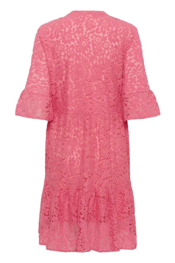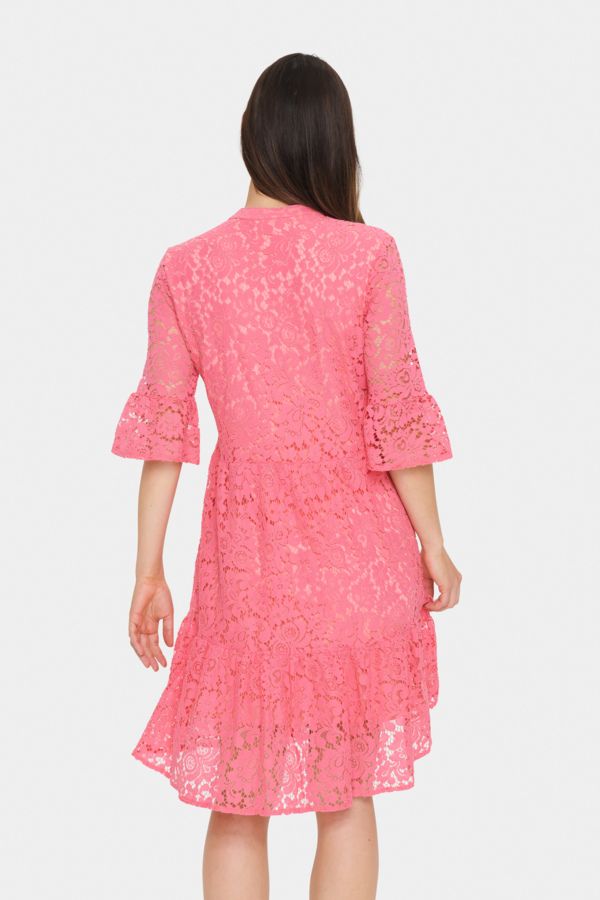 This beautiful lace dress by Saint Tropez captivates with its fresh colour and romantic look. The dress is made from an eye-catching, all-over lace fabric that adds lightness and feminine elegance to the design. The lace fabric is lined underneath, except for the sleeves. The V-neckline creates a flattering silhouette, while the wide 3/4-length sleeves add a striking yet airy touch.