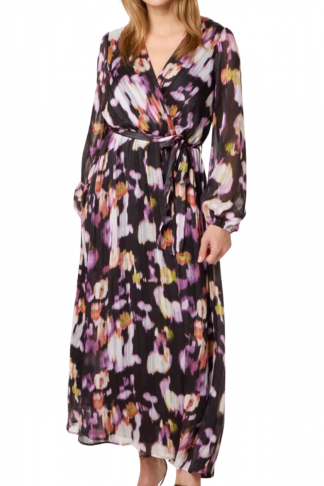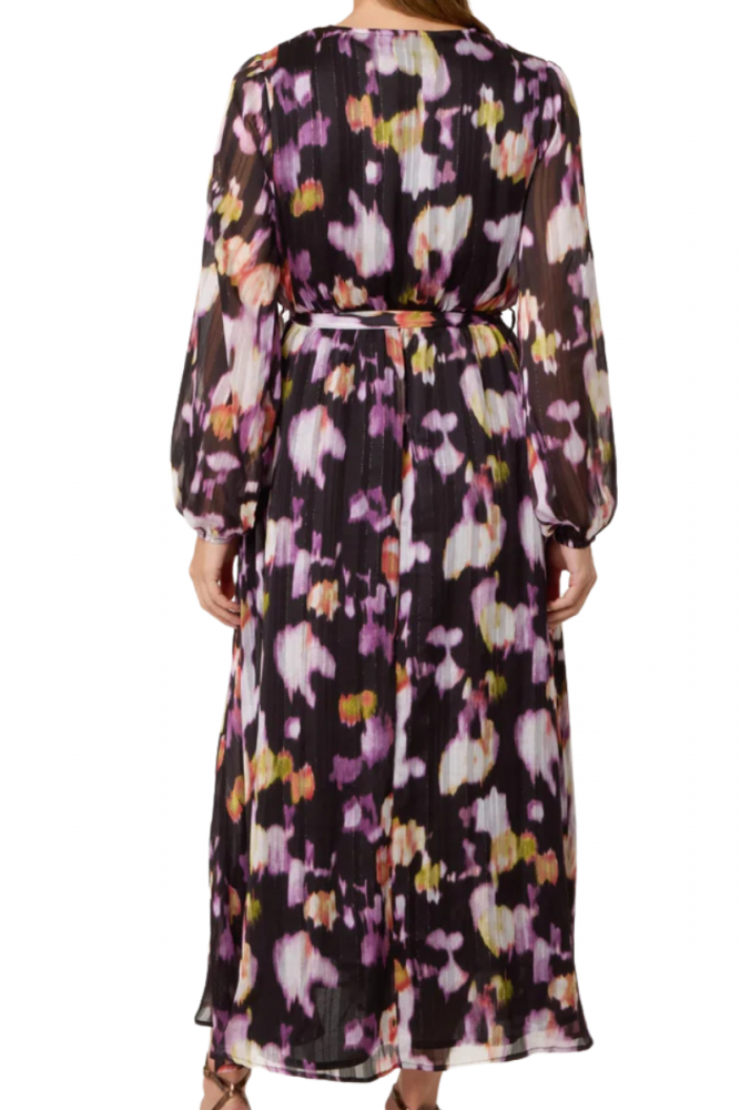 Pitkä mekko, jossa upea värikäs kuviointi. Kankaassa kulkee myös kimalle lankaraidoitus, joka antaa mekkoon juhlavuutta. Kauniit läpikuultavat hihat. Miehusta ja hameosa vuorattu.