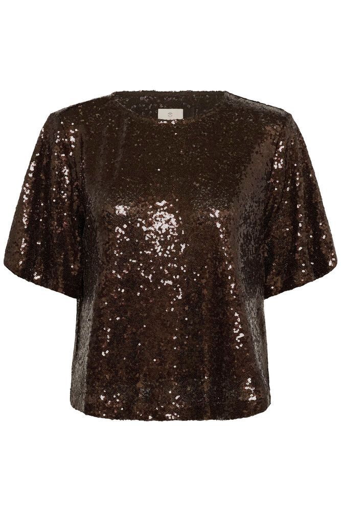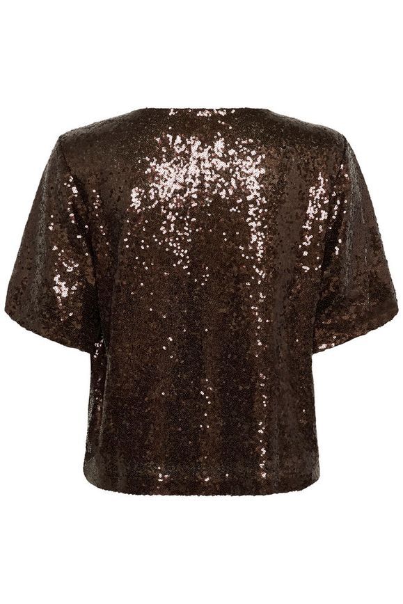 Sädehdi tässä juhlavassa ruskeassa Nicole paljettipuserossa! Paidassa on lyhyet hihat ja pyöreä pääntie.