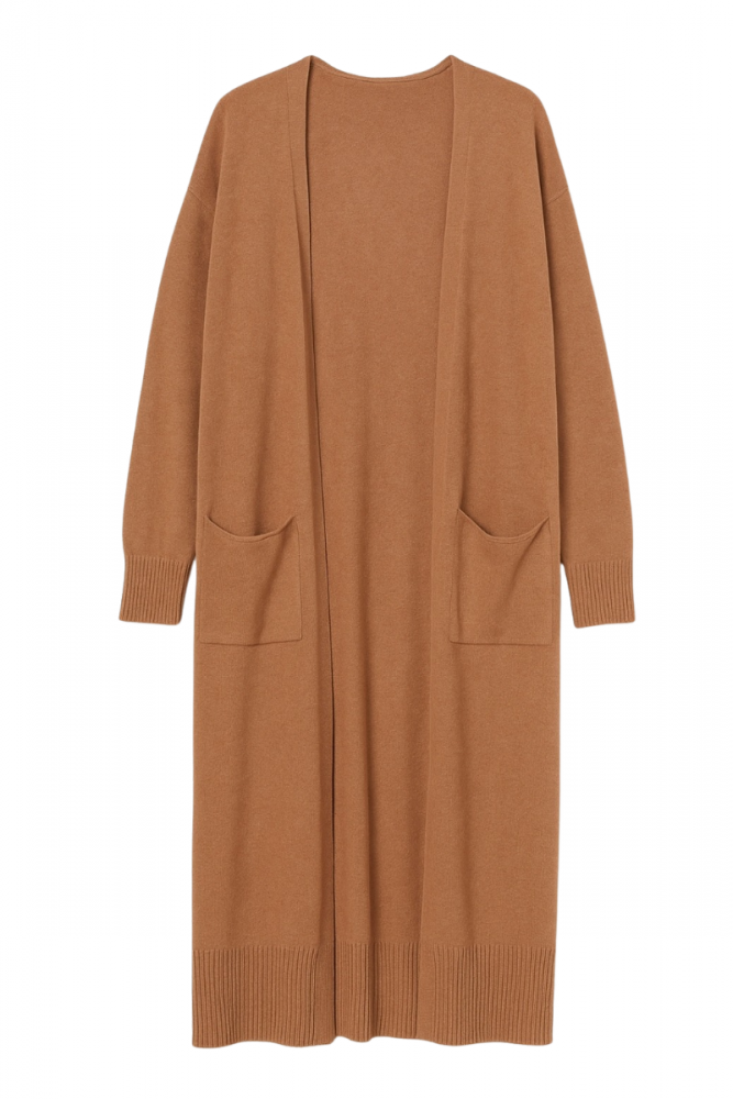 Pitkä, puoleen pohkeeseen ulottuva neuletakki. Edessä taskut. Lasketut hartiasaumat ja täyspitkät, reilut hihat tekevät neuletakkiin kivan rennon fiiliksen. Erittäin mukavaa ja erittäin joustavaa materiaalia.