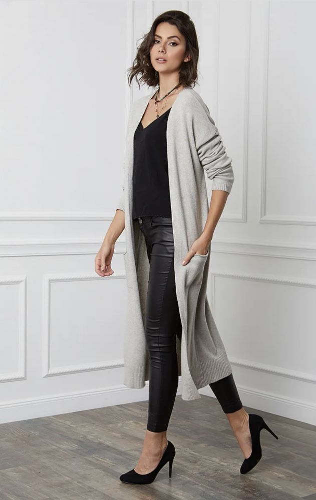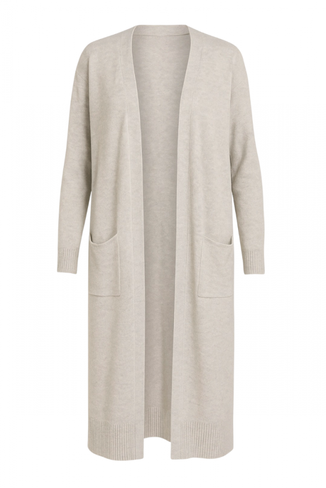 Pitkä, puoleen pohkeeseen ulottuva neuletakki. Edessä taskut. Lasketut hartiasaumat ja täyspitkät, reilut hihat tekevät neuletakkiin kivan rennon fiiliksen. Erittäin mukavaa ja erittäin joustavaa materiaalia.