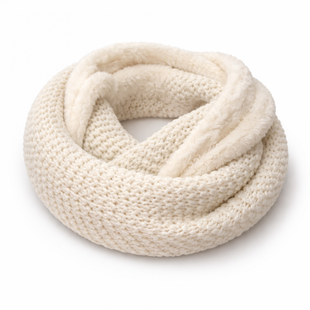Lämmin "infinity" kietaisuhuivi (ommeltu lenkiksi), joka on kaunis ja lämmittää mukavasti. Huivi riittää kietaistavaksi kaksi kertaa kaulan ympäri. Toisella puolella neulos ja toinen puoli pehmeää tekoturkista.