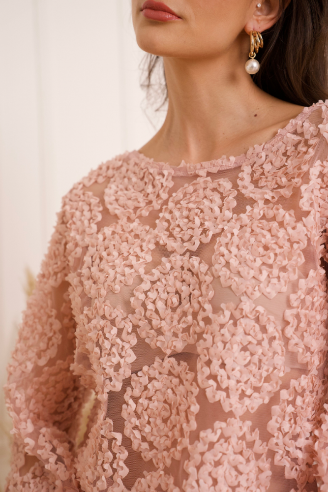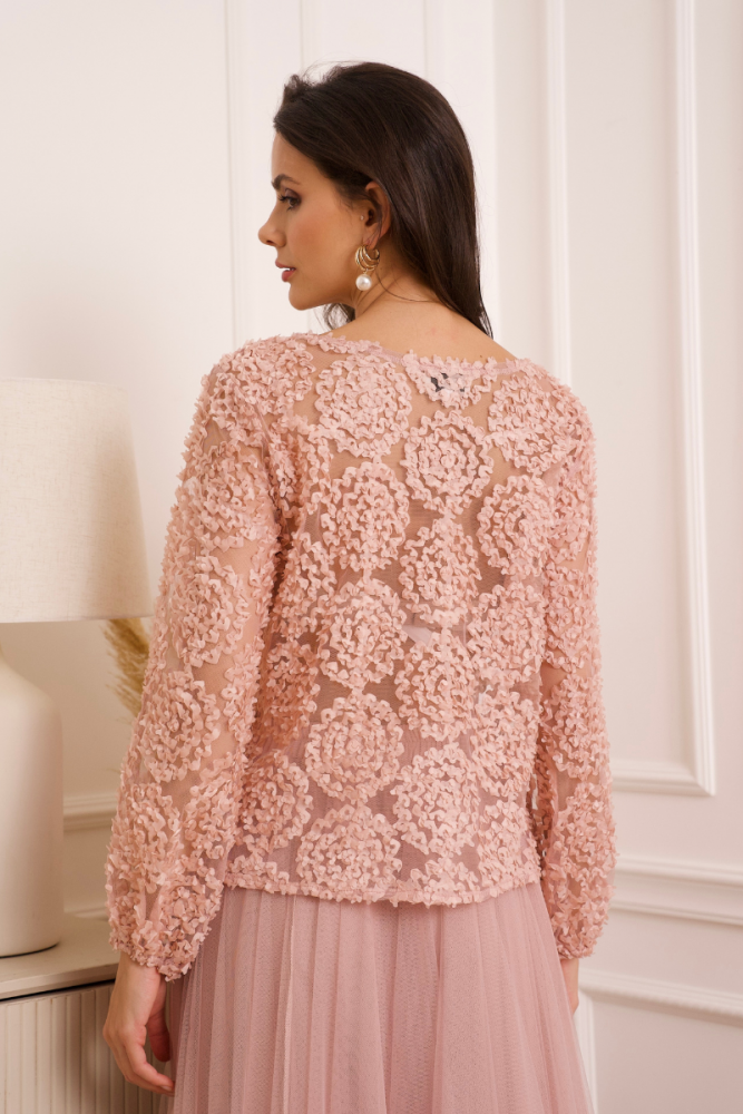 Naisellinen ja juhlava pusero, jossa kauniit pussimaiset hihat. Materiaali ohutta verkkokangasta, johon on ommeltu ihastuttava kukkamainen kuviointi.