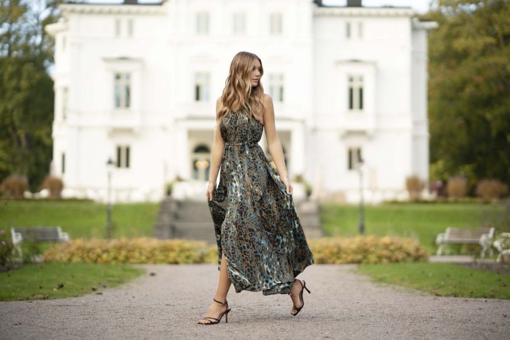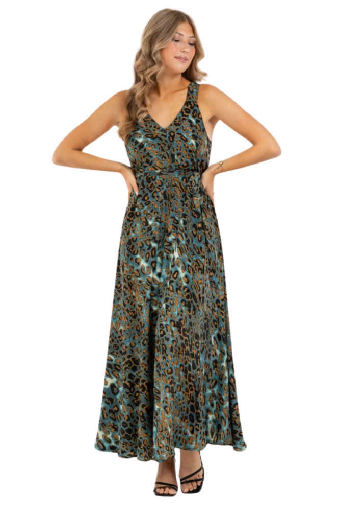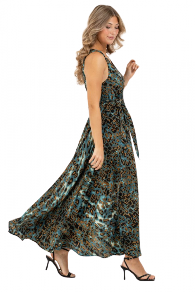 Upea maksimittainen Valkyria mekko leveällä helmalla. Näyttävä, leopardikuosi petroolin, pronssin ja mustan sävyisenä. Vyötäröllä kankainen vyö, jolla voit halutessasi korostaa vyötärölinjaa.