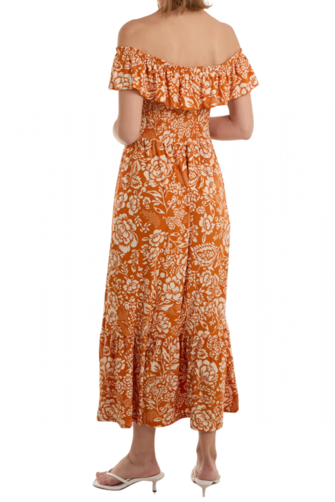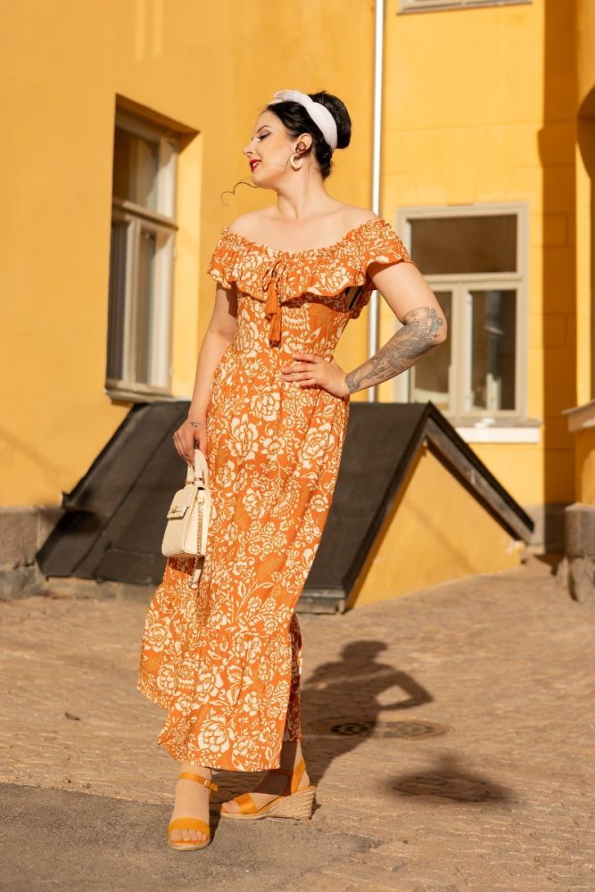 Kaunis, naisellinen mekko, jossa retrotyylinen kukkakuosi. Kaula-aukkoa reunustaa ihastuttava röyhelö. Pääntie on joustava ja olkaimia voit käyttää joko olkapäiden päällä (peittää liivin olkaimet) tai olkapäiden alla. Takana lisäksi joustorypytys, joka lisää mukavuutta ja istuvuutta. Pitkähkö, ihanasti laineileva helma. Tässä mekossa on myös taskut sivusaumoissa - täydellistä!