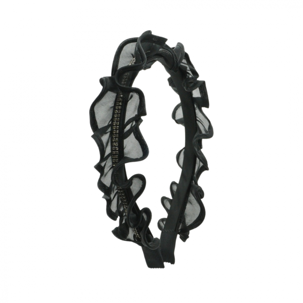 Musta hiuspanta, joka koristeltu mustilla pienillä helmillä sekä kauniilla mustalla röyhelöllä.