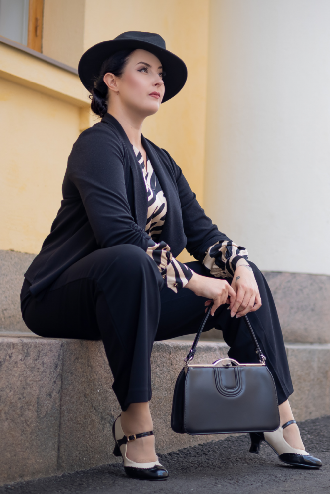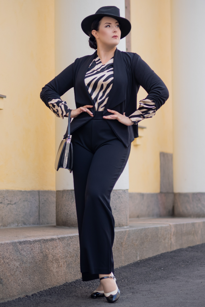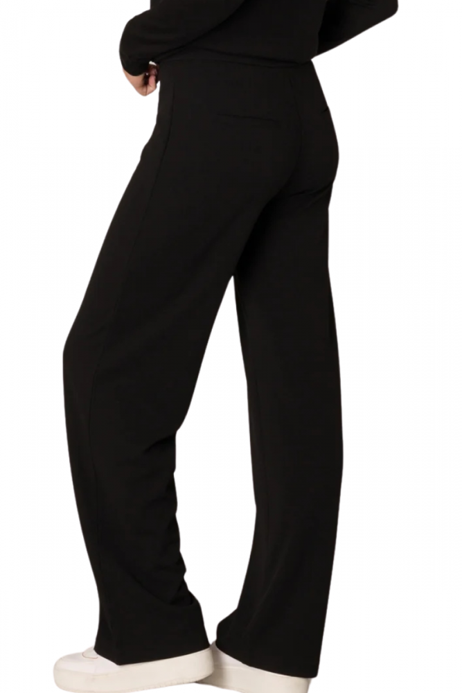 Rennot, mutta tyylikkäät mustat housut suorilla lahkeilla. Mukavasti joustava vyötärö ja takana lisäksi joustorypytys tuomassa lisämukavuutta. Kevyt, kauniisti laskeutuva materiaali, jossa pieni jousto.