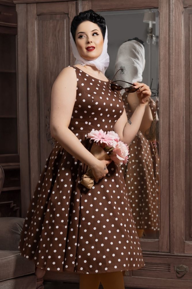 Hearts & Rosesin ihastuttava vintagetyylinen mekko, jossa suklaanruskealla pohjalla valkoisia polkadoteja. Klassinen 50-luvun tyylinen malli, jossa pyöreä kaula-aukko sekä umpinainen selkä. Mukava, joustava puuvilla-stretchkangas. Mekossa on istuva yläosa, sekä leveä kellohelma. Helma ulottuu hieman polven alapuolelle. Vetoketju sivussa. Taskut sivusaumoissa.