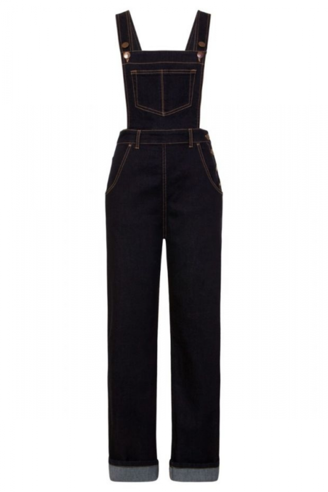 Tummansiniset denimhaalarit, joissa etutaskut sekä takataskut. Lappuosassa myös kätevä tasku. Säädettävät, takaa ristiinmenevät olkaimet.
