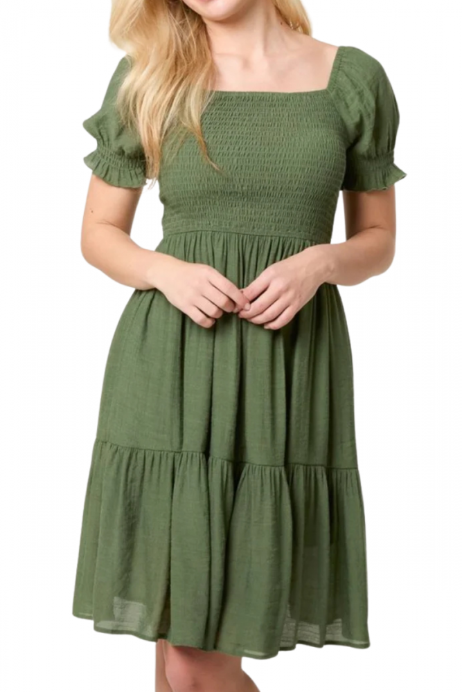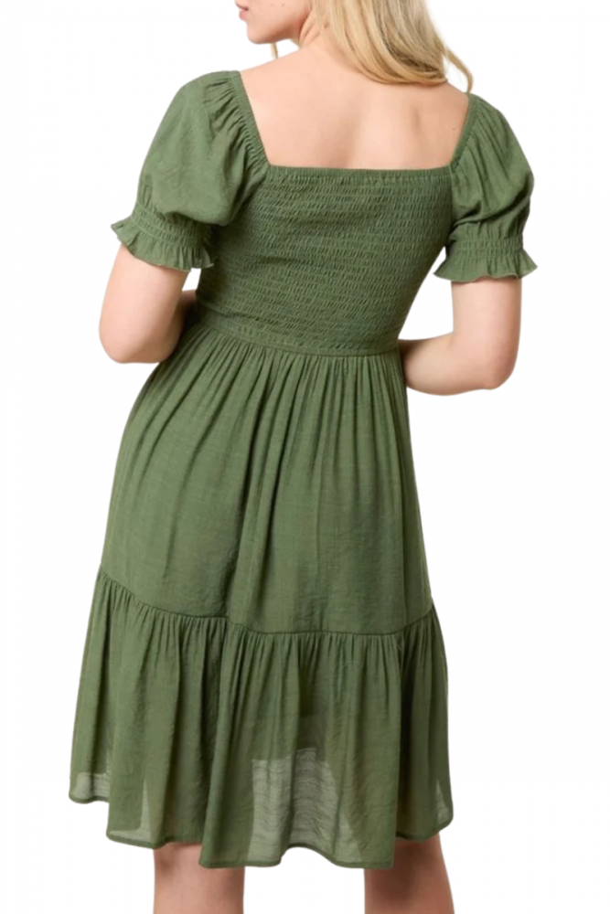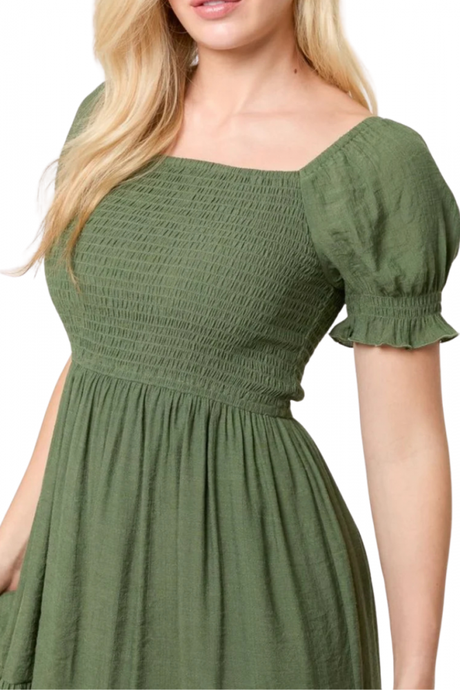 Vintagetyylinen, lyhyt mekko kauniissa oliivinsävyssä. Hihansuissa joustokuminauhat, jotka tekevät hihoihin kauniin pussimaisen muodon. Rypytetty yläosa, joka on joustava. Mukava, kevyt materiaali.