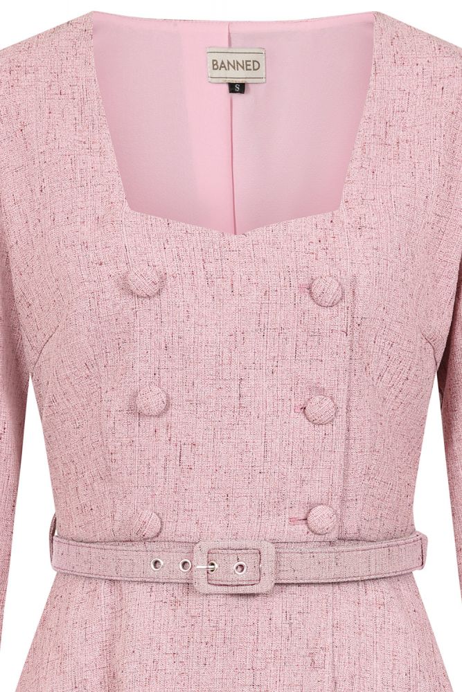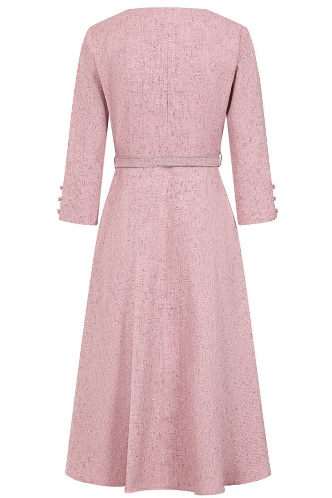 Upea vintagetyylinen kietaisumallinen mekko, jossa yksityiskohtia on todellakin mietitty! Kudotussa kankaassa vaaleanpunaisen seassa on myös kaunista viininpunaista, joka tuo kankaaseen kauniin säväyksen!