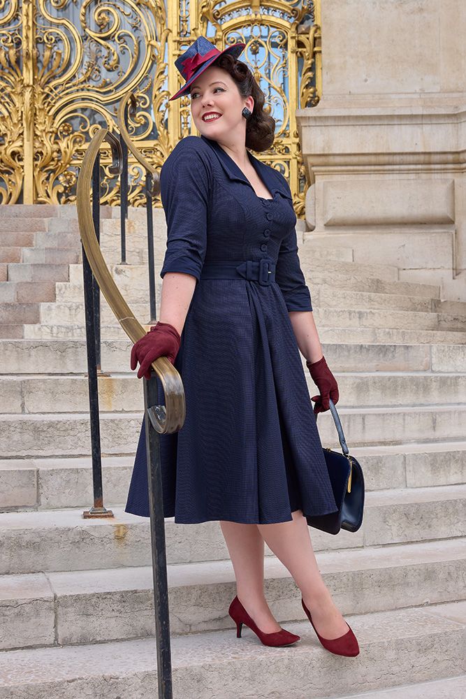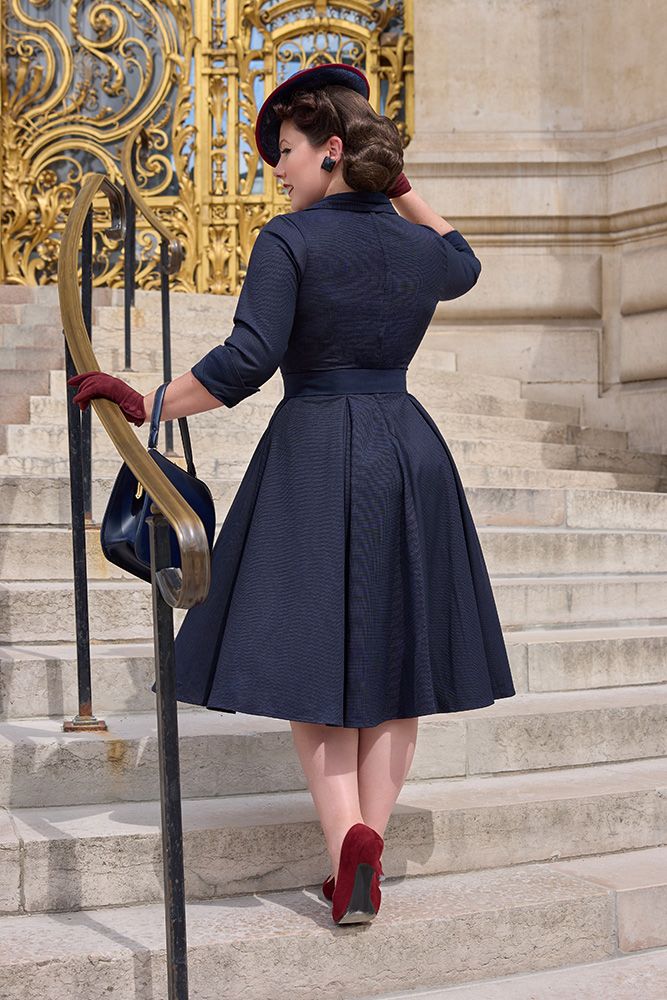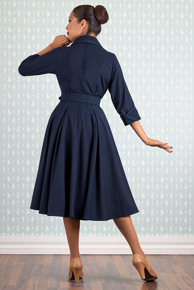 Istuva yläosa, kontrastivärinen kaulus ja hihansuut sekä napit edessä tuovat mekkoon hienostuneen viimeistelyn. Neliönmuotoinen pääntie korostaa kauniisti dekolteeta, ja leveä vyötäröä korostava vyö viimeistelee lookin.
