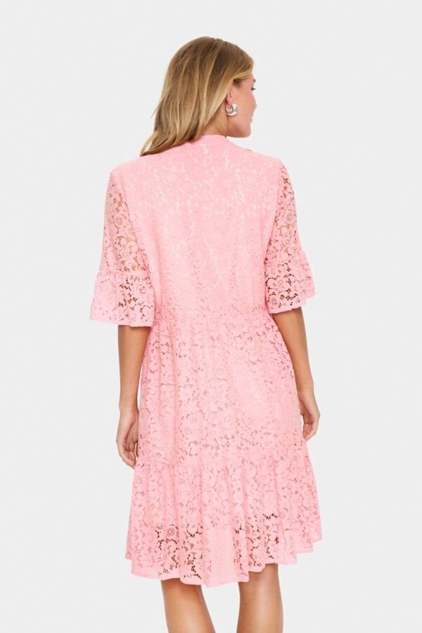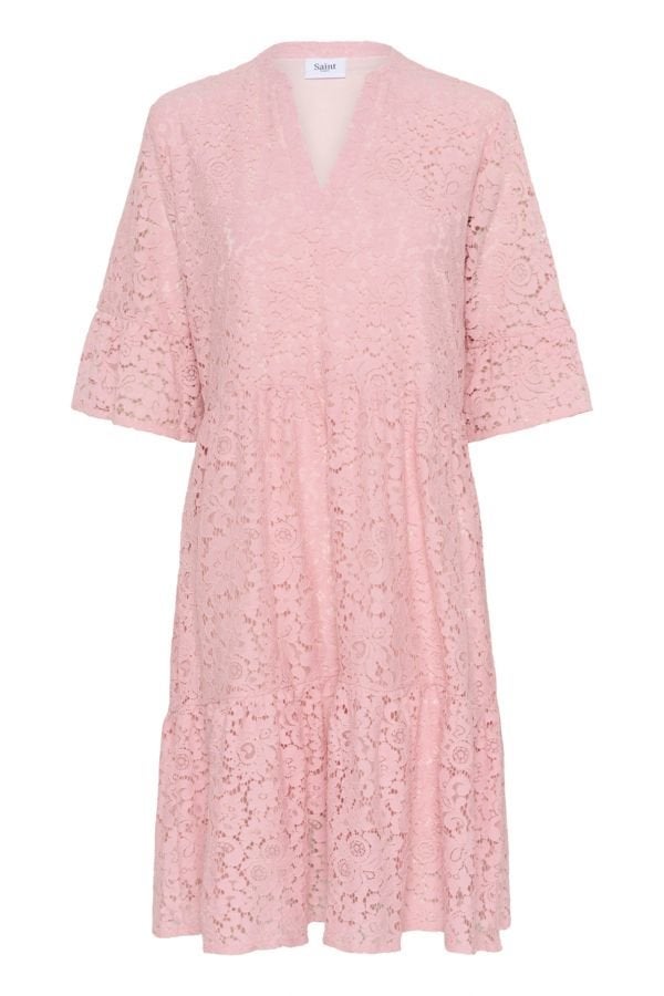 Tämä Saint Tropezin kaunis pitsimekko hurmaa hempeällä vaaleanpunaisella sävyllä ja romanttisella ilmeellään. Mekko on valmistettu näyttävästä, kauttaaltaan pitsikuvioidusta kankaasta, joka tuo asuun keveyttä ja naisellista eleganssia. Pitsikankaan alla vuorikangas, lukuunottamatta hihoja. V-pääntie antaa kauniin ja imartelevan linjan, ja 3/4-pituiset leveähköt hihat lisäävät mekkoon näyttävyyttä ja kevyttä ilmettä.