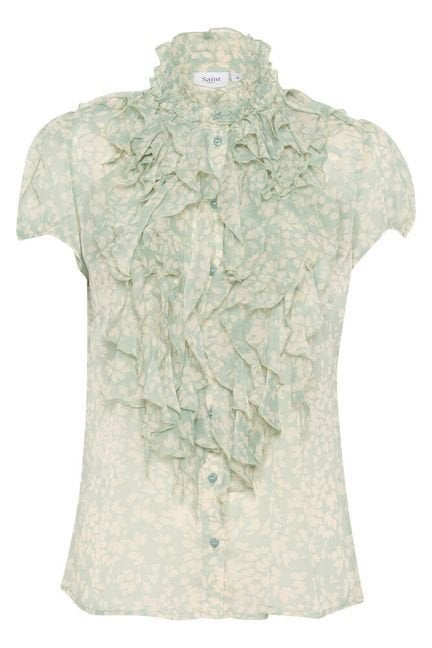 Kaunis, naisellinen pusero, jossa lyhyet puhvimaiset hihat ja upea näyttävä röyhelö rinnassa. Pystykaulus, jota reunustaa myös naisellinen röyhelö. Edessä napitus.