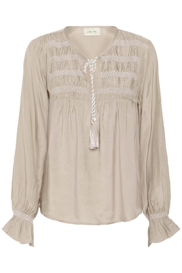Creamin Nouria-pusero huokuu pehmeää romantiikkaa ja huoliteltua boheemia tunnelmaa. Kauniisti laskeutuva viskoosi tuntuu miellyttävältä päällä ja tekee puserosta kevyen, ilmavan ja naisellisen rennon valinnan kevään ja kesän asuihin.