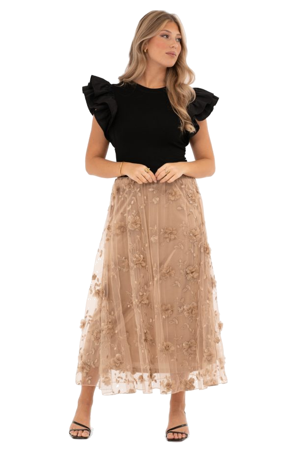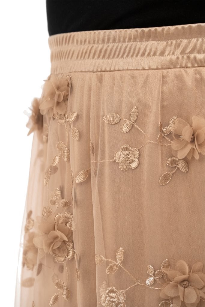 Florence-tyllihame hurmaa romanttisella kukkakirjailullaan ja kauniisti laskeutuvalla, kevyellä tyllillä. Pehmeä kullanbeige sävy ja kolmiulotteiset kukkayksityiskohdat tuovat hameeseen ylellistä ilmettä, joka sopii täydellisesti myös juhlavampiin hetkiin.