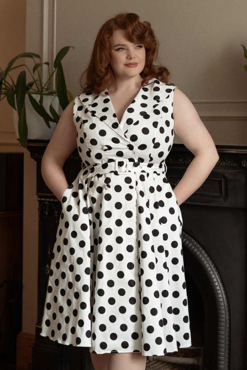 Clarissa Polkadot -kellomekko on ajaton klassikko, joka hurmaa mustavalkoisella pallokuosillaan ja elegantilla 50-luvun siluetillaan. Tämä naisellinen kellomekko yhdistää leikkisän retrofiiliksen ja viimeistellyn istuvuuden – täydellinen valinta niin arkeen, juhlaan kuin kesäisiin tapahtumiin.