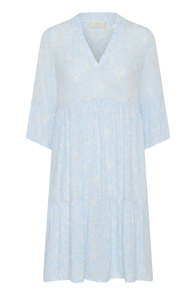 Tämä Kaffen kreppiviskoosimekko hurmaa raikkaalla vaaleansinisellä sävyllään ja pehmeällä kukkakuosilla, joka tuo asuun kevyen ja kesäisen tunnelman. Ilmavasti laskeutuva materiaali tekee mekosta miellyttävän käyttää, ja väljä a-linjainen malli luo rennon fiiliksen.