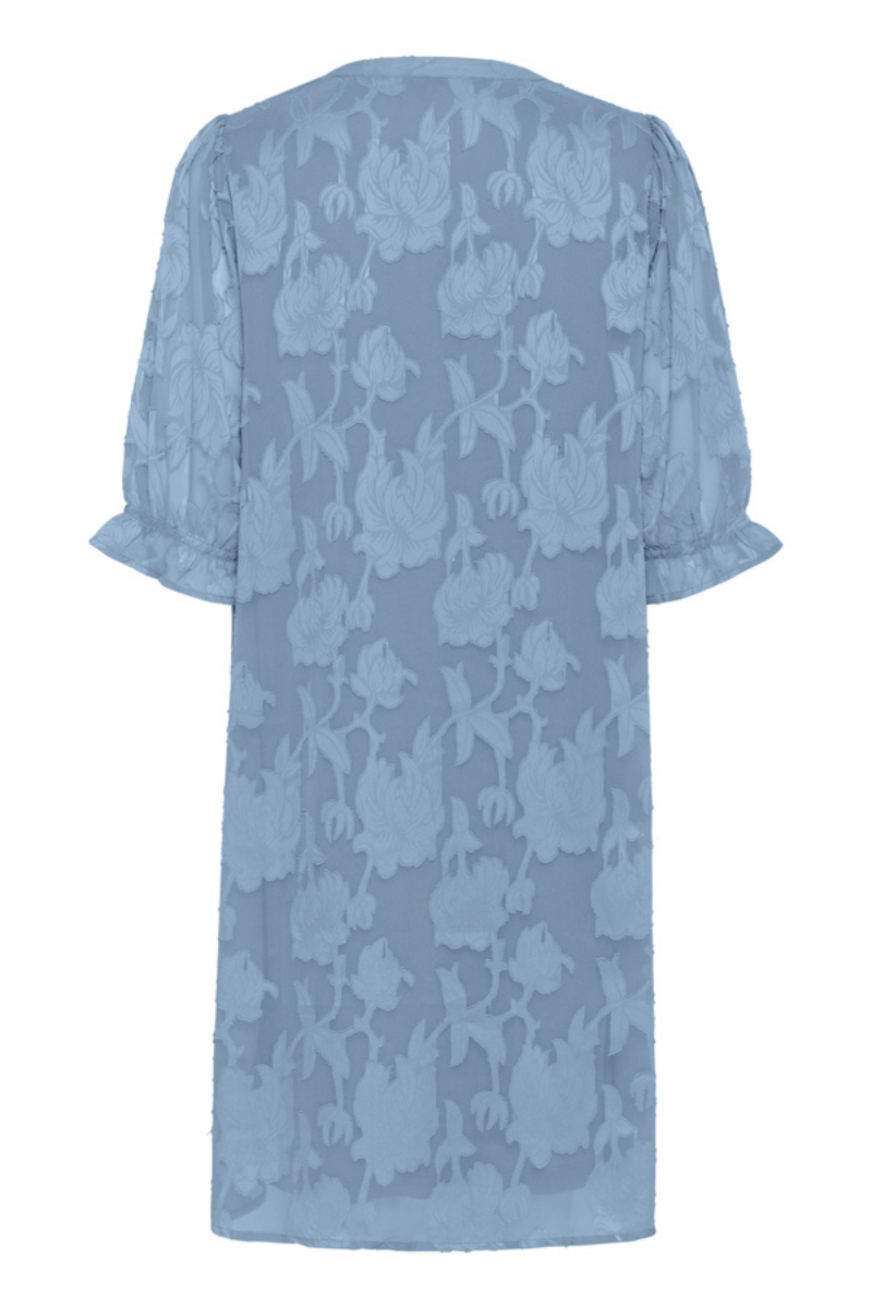 Creamin Yana-mekko hurmaa keveydellään ja romanttisella ilmeellään. Kuultava, hennosti kuvioitu kukkakangas luo mekkoon kauniin ilmeen, ja kaunis sininen sävy tekee kokonaisuudesta erityisen raikkaan ja naisellisen.