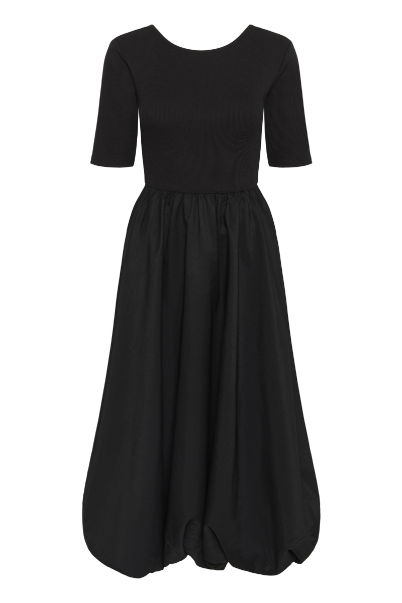 Kaffen musta Kirsten-mekko on täydellinen yhdistelmä mukavuutta ja tyyliä. Yläosan pehmeä ja joustava ribbineulos istuu kauniisti vartalolle ja tekee mekosta miellyttävän käyttää koko päivän ajan. Leveä ja runsas pallomainen helma tuo siluettiin ilmavuutta ja dramatiikkaa.