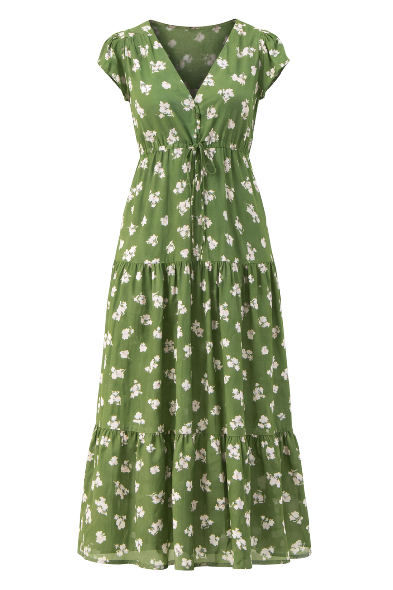 Vyötäröllä oleva säädettävä nauha antaa mahdollisuuden muotoilla istuvuutta juuri omaan tyyliin sopivaksi – mekko tuntuu yhtä aikaa rennolta ja imartelevalta. Pehmeä v-pääntie, pienet napit sekä lyhyet hihat tuovat kokonaisuuteen kesäistä keveyttä, ja kerrostettu helma lisää liikettä sekä boheemia tunnelmaa.
