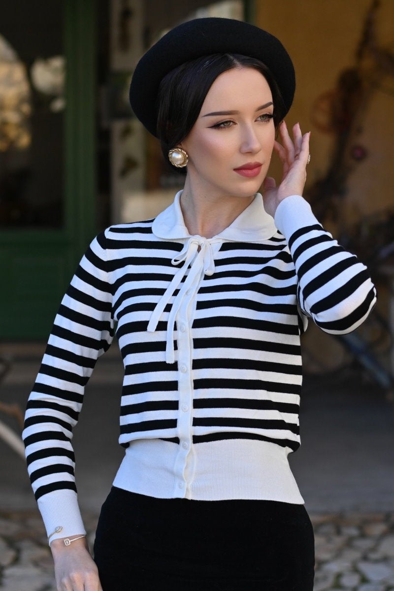 Monroe Stripe -neuletakki on ajaton ja elegantti valinta, jossa yhdistyvät klassinen 50-luvun henki ja moderni käyttömukavuus. Mustavalkoinen raitakuosi on ikuinen klassikko, joka tuo asuun ryhdikkyyttä ja hienostunutta vintage-tunnelmaa.