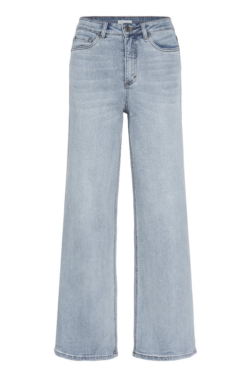Kaffen Meadow-farkut ovat rennon tyylikäs valinta arkeen. Vaaleansininen pesu tuo asuun raikkautta ja keveyttä, ja leveät lahkeet antavat näyttävyyttä.