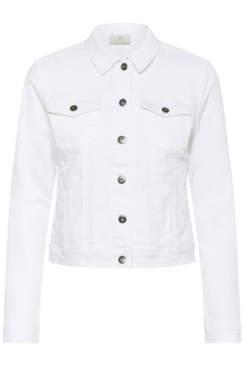 Kaffen Zelina-farkkutakki on raikas ja ajaton valinta kevääseen ja kesään. Valkoinen denim tuo asuun raikkautta ja tekee tästä takista täydellisen niin mekkojen, hameiden kuin housujenkin kanssa.
