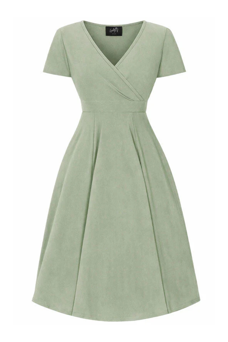 Kaunis, vintagetyylinen kellomekko, joka korostaa upeasti naisellisia muotoja! Mekossa on kietaisutyylinen, ristiinmenevä yläosa, joka muodostaa kauniin v-kaula-aukon. Lyhyet aaltoilevat hihat ja vyötäröllä samasta materiaalista valmistetut nauhat, jotka voit sitoa taakse kauniiksi rusetiksi. Leveä helma, joka tuo sen ihanan 50-luvun fiiliksen!