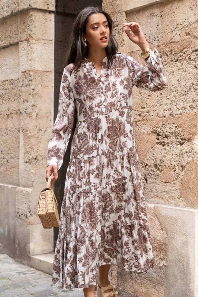 Pitkä, a-linjainen mekko, jossa valkoisella pohjalla kaunis ruskea paisley kuviointi. Pitkät hihat sekä napitus edessä. Erittäin kevyttä ohutta viskoosi-silkkiä, joka on ihana päällä!