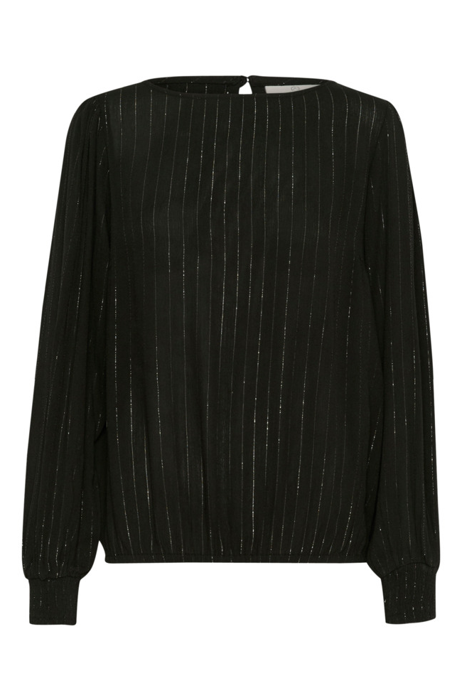 Tyylikäs musta pusero, jossa ohut pystyraidoitus hopealangalla. Materiaalina kevyt ja mukava kreppiviskoosi. Puserossa on o-kaula-aukko ja kauniit pussihihat. Olkapäillä pieni keräys ja hihansuissa joustava smokkirypytys. Helmassa on kuminauha, jolla saat säädettyä puseron pituutta.