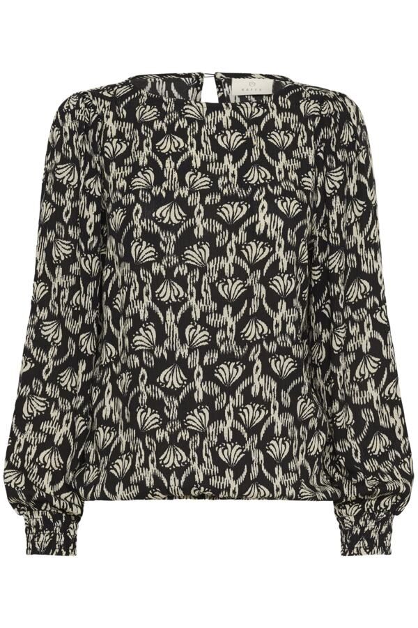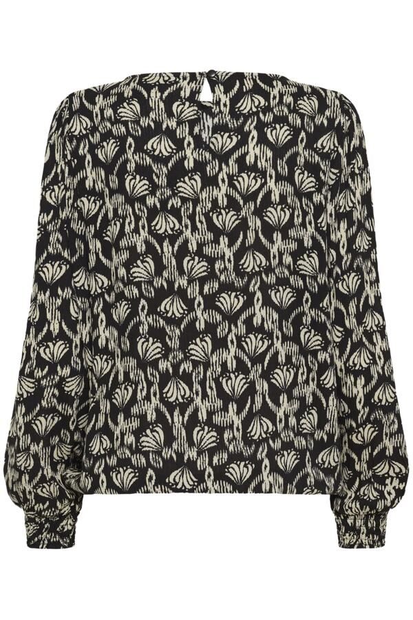 Tyylikäs musta pusero, jossa kaunis vaaleanbeige kuviointi. Materiaalina kevyt ja mukava kreppiviskoosi. Puserossa on o-kaula-aukko ja kauniit pussihihat. Olkapäillä pieni keräys ja hihansuissa joustava smokkirypytys. Helmassa on kuminauha, jolla saat säädettyä puseron pituutta.
