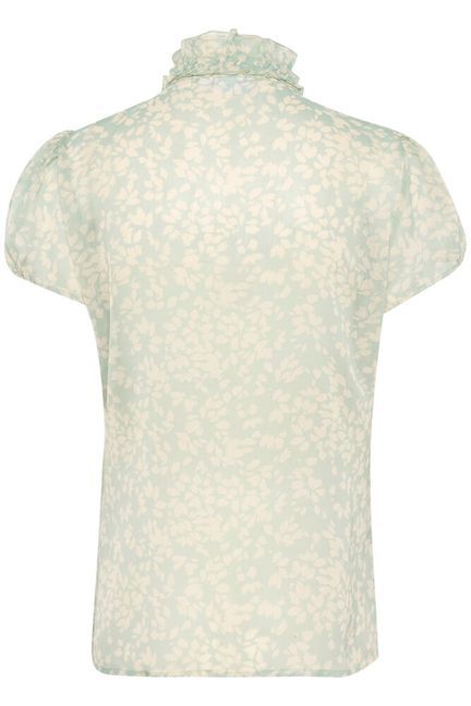 Kaunis, naisellinen pusero, jossa lyhyet puhvimaiset hihat ja upea näyttävä röyhelö rinnassa. Pystykaulus, jota reunustaa myös naisellinen röyhelö. Edessä napitus.