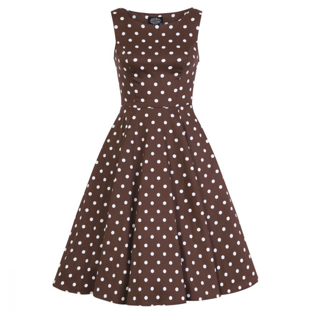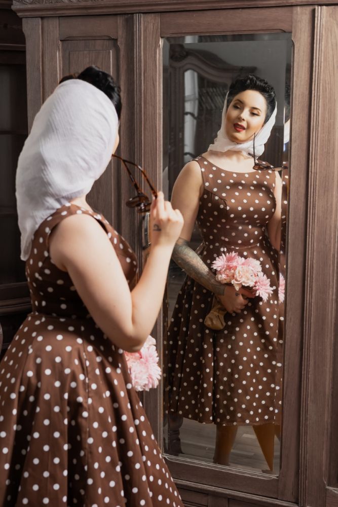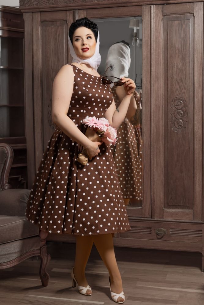 You will feel like a true vintage beauty in this dress! Timeless 50’s polka dot style. Beautiful brown swing dress with lovely white polkadots.
