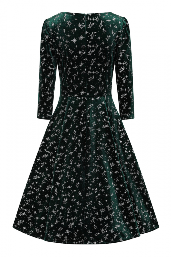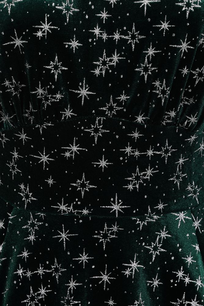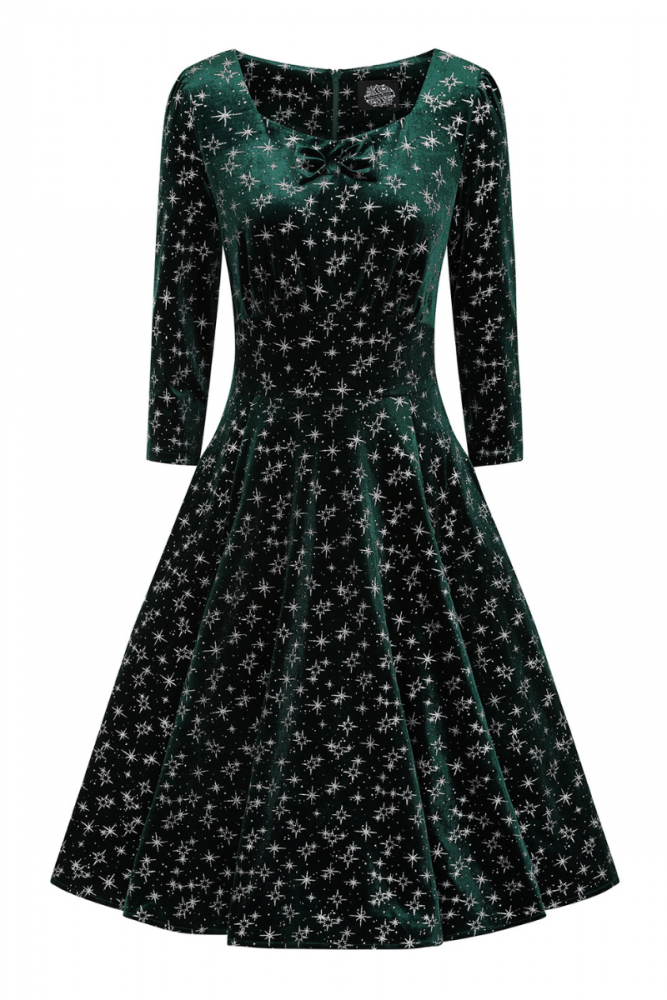 Step into the spotlight with this gorgeous Paris Sparkle Swing Dress. This dark green velvet party dress is adorned with sparkly details that add a touch of glamour to your wardrobe. The dress boasts a flattering sweetheart neckline and a charming front bow, perfect for any festive occasion. The gathered ¾ length sleeves and under-bust detailing enhance its elegant silhouette. A shaped waistband beautifully defines the waist, while concealed side seam pockets add a practical touch without compromising style.