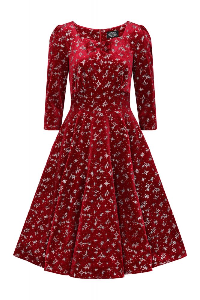 Step into the spotlight with this gorgeous Paris Sparkle Swing Dress. This red velvet party dress is adorned with sparkly details that add a touch of glamour to your wardrobe. The dress boasts a flattering sweetheart neckline and a charming front bow, perfect for any festive occasion. The gathered ¾ length sleeves and under-bust detailing enhance its elegant silhouette. A shaped waistband beautifully defines the waist, while concealed side seam pockets add a practical touch without compromising style.